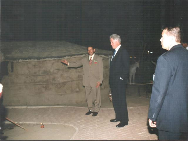 President admiring the life like model of the Masaai women, with the Masaai hut in the background